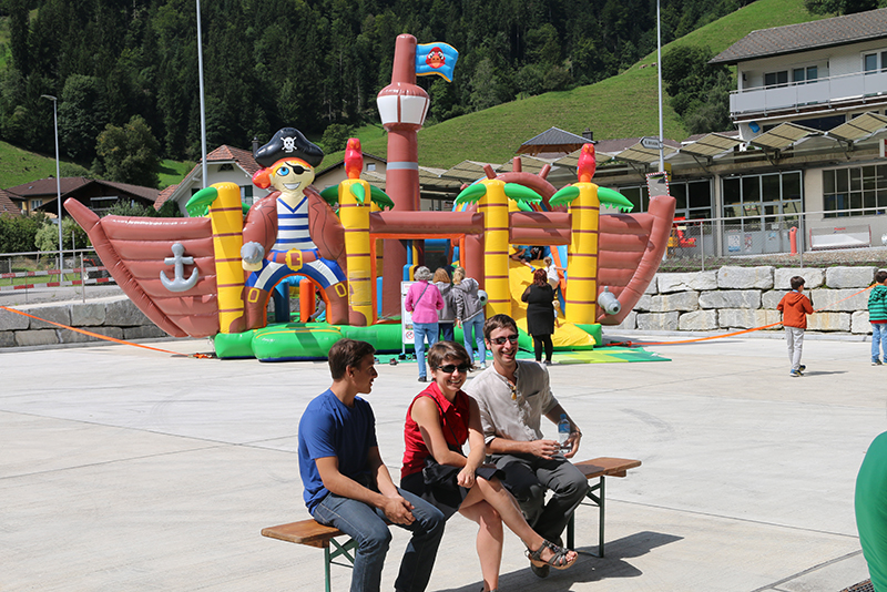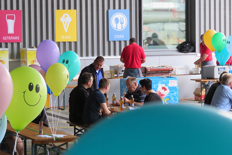 Da bekanntlich nach der Arbeit das Vergnügen folgen soll, war natürlich auch für Speis und Trank und für Musik und Unterhaltung gesorgt. So spielte eine Ländlerkapelle und während die einen assen, tranken und gesellige Gespräche führten, vergnügten sich die anderen beim Torwandschiessen, beim Strategiespiel «Vier gewinnt», am XXL-Töggelikasten oder – die ganz kleinen – auf der imposanten Hüpfburg.