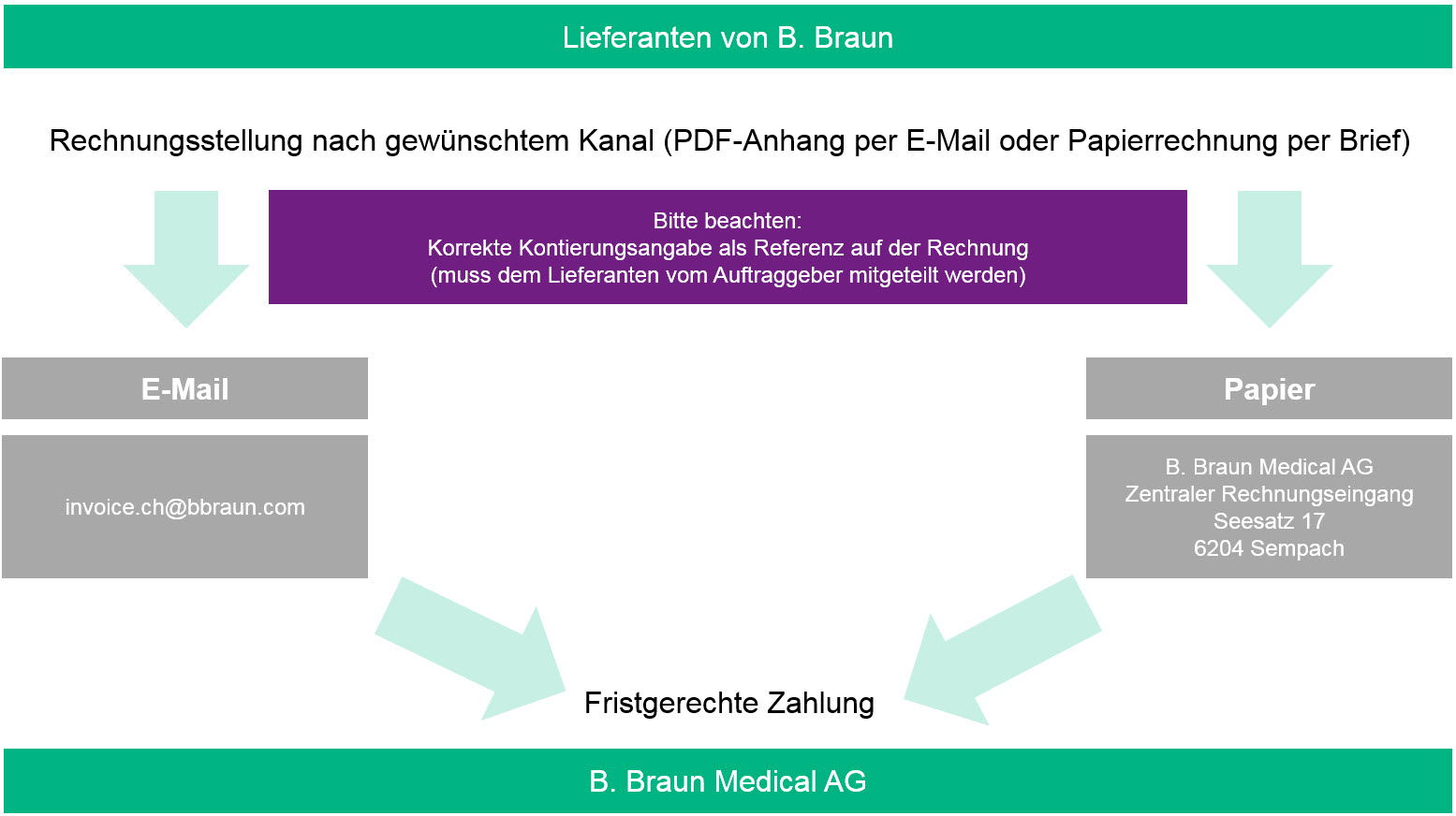 Anforderungen für die Rechnungsstellung Nach Beachtung unserer allgemeinen Rechnungsanforderungen, geben Sie bitte neben der E-Mail-Adresse des Bestellanforderes (z.B. max.muster@bbraun.com) eine der drei B. Braun-spezifischen Kostenträger und wenn möglich ein Sachkonto an: Kostenträger / Sachkonto - Kostenträger für eine Kostenstelle: CC 276081050 (9-stellig) - Kostenträger für ein Projekt: T.276-0322.08-3-02 - Kostenträger für einen Auftrag: IO 27603000541 Falls Ihr B. Braun-Ansprechpartner Ihnen ein Sachkonto genannt hat, geben Sie das Sachkonto in folgender Form an: ACC 68500010 Bestellnummer Wenn Ihnen Ihr Ansprechpartner eine Bestellnummer genannt hat, entfällt der Kostenträger und das Sachkonto. Geben Sie in diesem Fall einfach die Bestellnummer in folgender Form an: 4507801778 |